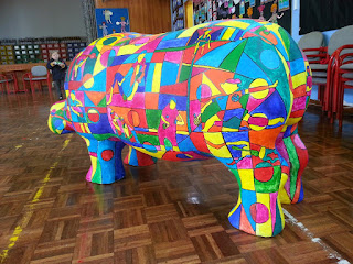 In Spring 2014, I was contacted by a class of students in Glenrothes, Fife, Scotland. They requested permission to use my style of art as inspiration for an art project. For this Towns Schools Art Project, they chose a sculpture of a hippo, which is the town mascot. Each student contributed, painting directly on the hippo in my style. I am pleased and honored to share "Randall" the Hippo for your viewing pleasure.